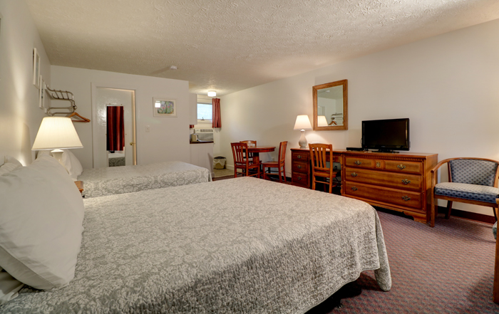 The efficiency motel units are grouped in Building 1 and Building 2, separated by our outdoor pool, hot tub and game areas. Most of the units offer a queen and a double bed for up to 4 guests. Guest Rooms 10, 11 and 22 offer a queen bed plus a queen sleep sofa. Unit 24 has a single bed. A sampling of our guest rooms follows, illustrating bed and furniture configurations as well as decor.
